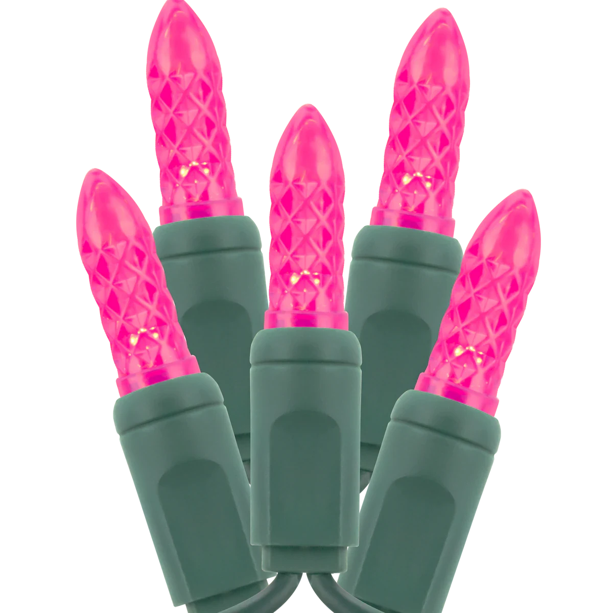 These Traditional M5 Mini shaped commercial lights are the Gen 2 CLS-MINI Holiday lights. The American Lighting Mini M5 LED Holiday light bulb covers will not fade, chip or peel. There are no glass bulbs to replace or break as these are permanent LED lamps. This string of M5 Mini LED Holiday lights uses either 2.4 or 4.8 watts per string depending on the color and runs off of 120 volt energy. The Green 20AWG wire supports long runs. Each commercial Holiday light set is 25 feet long and has 50 bulbs per string (6" spacing). You are able to connect up to 125 LED string lights end-to-end to a single power adapter.
