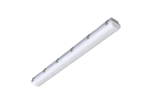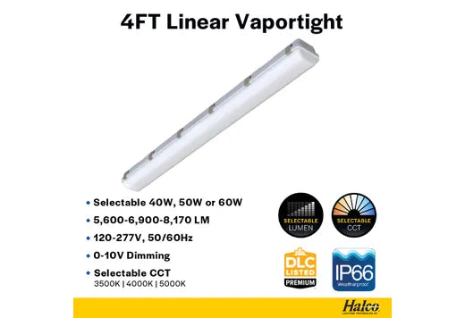The Halco Lighting LVPT-4-LS-CS-U (28111) is a 47.3 inch (4 foot) long fixture and only 3.7 inches deep, ideal for any application. This Halco 4-foot vapor tight fixture consumes a selectable 40/50/60 watts of 120-277 volt energy. They generate between 5600-8590 lumens (136-143 lumens per watt), have a rated lumen maintenance of 100,000 hours based on L70 lumen depreciation, a selectable color temperature of 3500K Bright White, 4000K Cool White or 5000K Daylight and a CRI of 80. These DLC Premium listed LED vapor tight lights have a 0-10V dimmable configuration. All Halco LED vapor tight fixtures carry a 5 Year Limited Warranty.