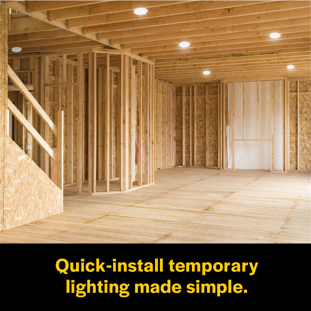 The Temporary Disk Light is engineered to deliver both performance and convenience on the job site. Its low-profile design utilizes quick-connect wiring and is compatible with 2.75", 3.5", and 4" junction boxes, simplifying installation. The diffused lens ensures even illumination without pixilation, and its damp-location rating makes it suitable for a wide range of environments. The Temporary Disk Light provides a reliable, efficient, and adaptable lighting solution that remains in place throughout construction phases, offering continuous illumination until permanent fixtures are installed.