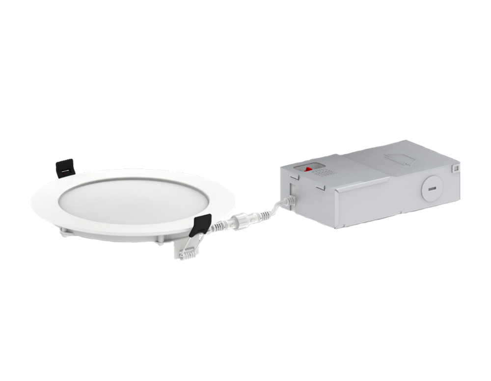 The Keystone Technologies 6 Inch color selectable slim wafer LED downlight is available in a sleek black or white finish. The Circa downlight can switch between five different color temperatures including: 2700K warm white, 3000K warm white, 3500K bright white, 4000K cool white and 5000K daylight with a CCT selection switch location on the built in junction box. This LED downlight operates at 120 volt at a 13 watts and generates between 1,000-1,080 lumens respectively. With its remote driver and built-in junction box, the  eliminates the need for a traditional multipiece fixture setup. With a CRI (color rendering index) of 90, this wafer retrofit is dimmable and is suitable for wet locations.